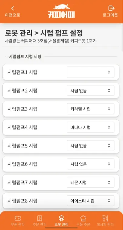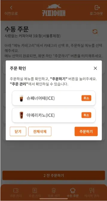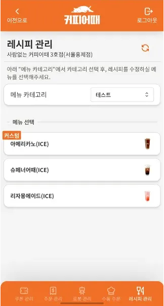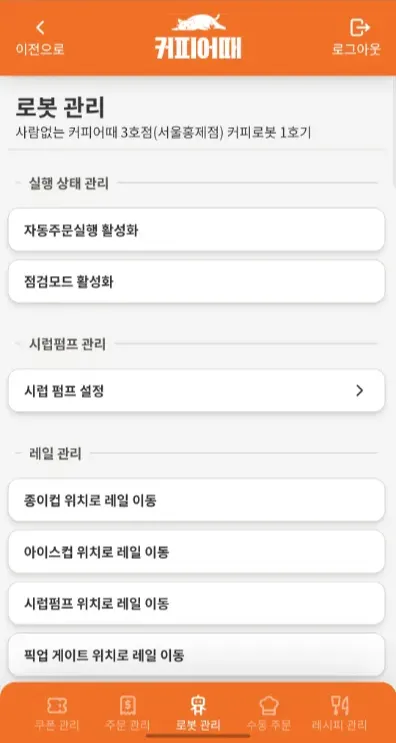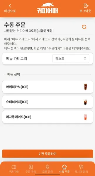 자신의 점포내 소속된 커피로봇에 결제 없이 점주가 원격으로 수동 메뉴 주문을 넣을 수 있는 기능을 제공함.