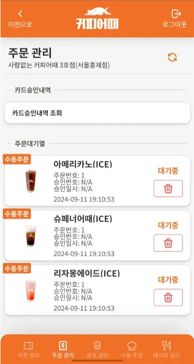 현재 KIOSK를 통해 발생한 음료 주문 건에 대한 조회/삭제 기능을 제공함.