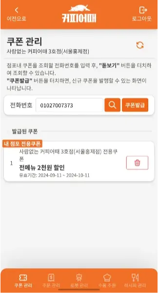 점주가 자신의 점포 전용 쿠폰을 고객에게 발급할 수 있는 기능을 제공함.