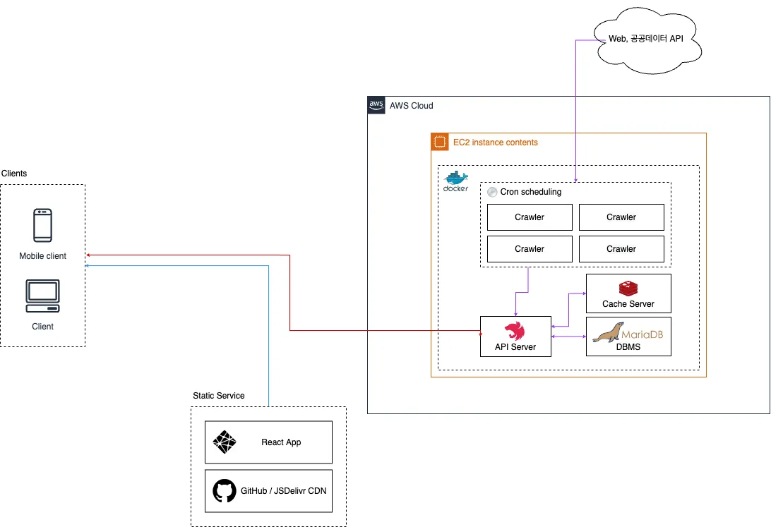 크롤러 인스턴스를 Cron을 통해 주기적으로 실행하여 공공데이터 API에서 데이터를 받아와 API 서버로 전달 (DB에 데이터 삽입은 전적으로 API 서버만이 수행한다.)