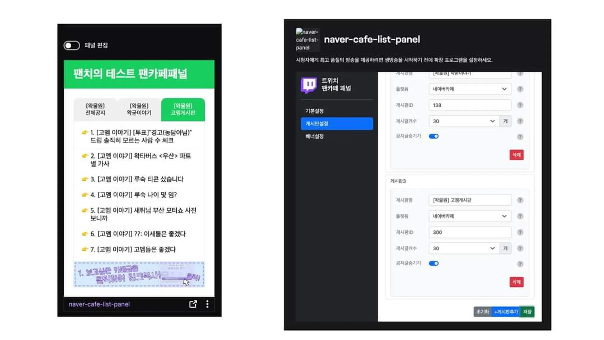 확장패널의 환경설정(파싱할 팬카페 유형 및 ID 설정, 배너 설정, 탭 설정)을 위한 어드민 패널 개발